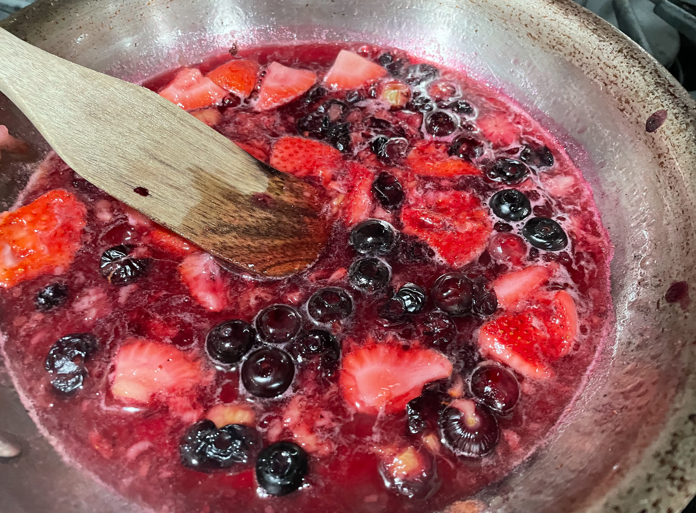 - In a medium saucepan over medium heat begin to cook down blueberries, strawberries, sugar, and water. Stir frequently