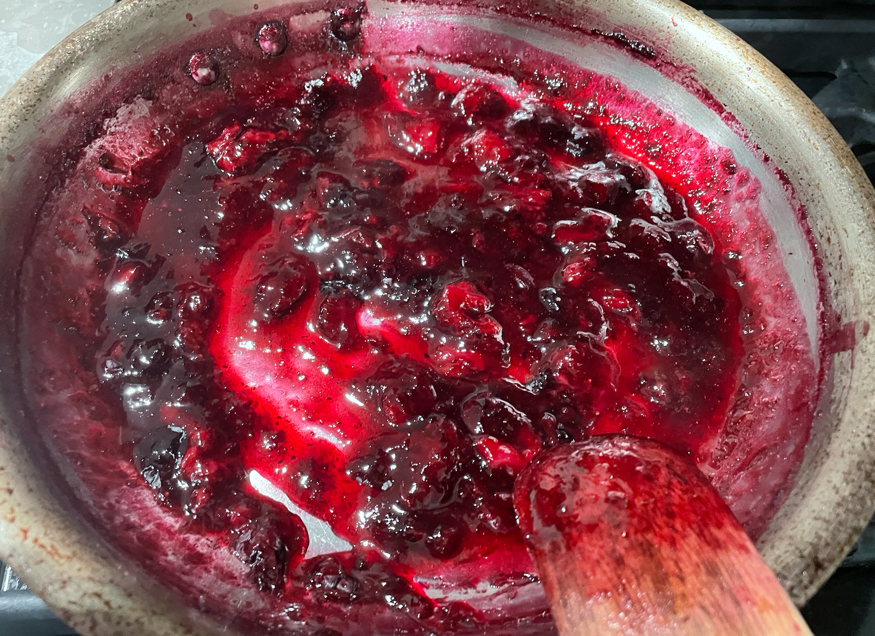 - Bring fruit to a boil and once it is there reduce to a simmer. Press on the fruits with the back of your spoon to smash